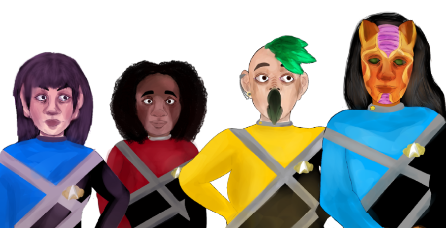 Lower Decks. L-R: T’Zy (Vulcan-Daughter of Oizys, Medical), Aphrodite Luxford (Human, Command), Rwivrev Boxa (Bajoran-Aurelian, Engineering), Leeii K’Jaey (Caitian-Kreetassan, Medical). These are the old uniforms and I need to redraw the Lower Decks four in the new uniforms (pictured above.)