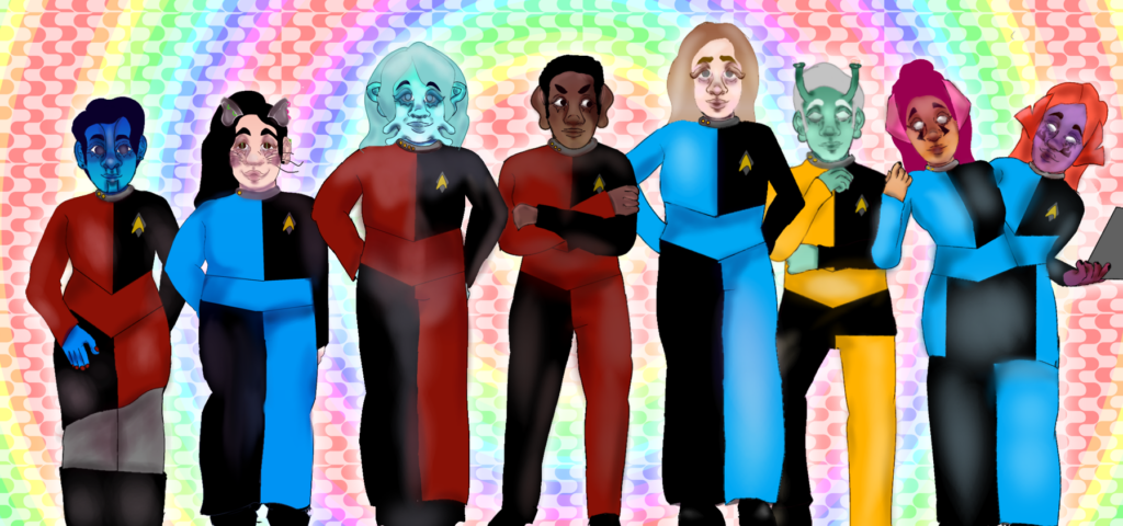 Command Crew. L-R: Xorienne (Betazoid-Bolian, Chief of Security), Clover V’Lyty (Human-Caitian, Xenoveterinary/biology ensign), Abstract Merp (Merp, Captain), T’Via (Vulcan, First Officer), Beatrice Glass (Human, Science Officer), Leklo (Aenar, Chief Engineer), Kal & Vrinna (Marlenn – Original Species, Chief Medical Officers). At one point I need to make us a communications officer and pilot.