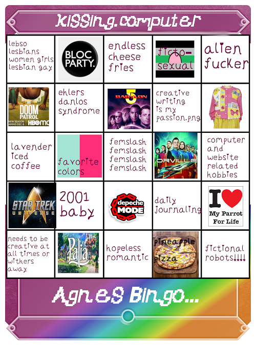 A little bit ago, it was common on certain social media communities to do “personal bingos”—you'd fill out a bingo card, putting in each square a little about yourself. For example, your favorite things, aspects of your identity, life experiences, opinions…. why don't I just show you mine so you can see what I mean…?